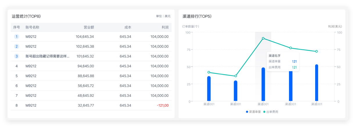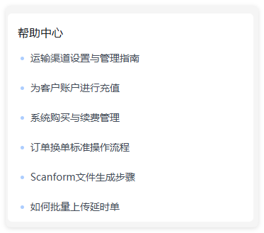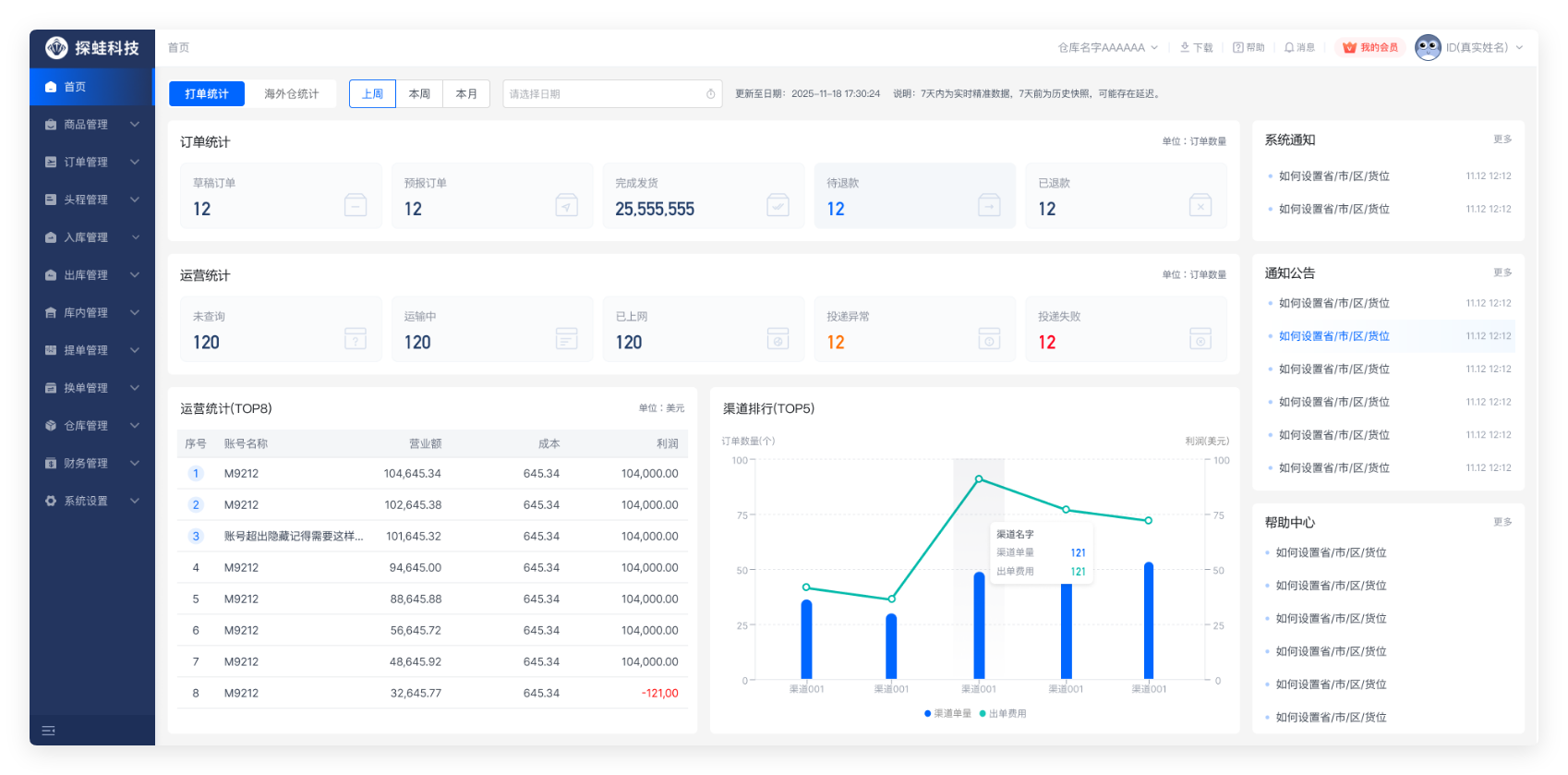 #### 一、OMS首页说明 * OMS首页专为打单人员设计,集中展示关键数据与核心功能。您可以在此便捷查看打单累计情况、单量分析、运营图表及账号资产等信息。掌握渠道出单排行榜单。  * 登录后的默认首页,聚合关键信息,助您快速决策。点击订单统计或运营统计卡片(根据运输轨迹状态汇总),可直接跳转至详情页进行深入操作。 * 系统默认显示本周,可以筛选本周、本月、上周维度查看不同单据的数据对比,也可以手动选择时间范围查看该范围内的单据数据变化。 #### 二、 使用说明 1、订单统计:模块均可点击跳转到对应页面查看详细信息,用户可可直接跳转至详情页进行深入操作。  * 草稿订单:指尚在草稿阶段、未正式提交的客户订单。 * 预报订单:指客户已成功提交预报的订单。 * 完成发货:指已生成物流面单的订单。 注意:处于“退款中”、“已退款”、“赔付中”、“已赔付”状态的订单不计入此项。 * 待退款:特指在“完成发货”的订单中,状态为“退款中”、等待处理的订单。 * 已退款:指已向客户已退款完成的订单。 2、运营统计:模块均可点击跳转到对应页面查看详细信息,用户可可直接跳转至详情页进行深入操作。  * 已出单 / 未查询:订单已生成物流面单,正等待快递员上门取件。 * 运输中:包裹已被揽收,正在运输途中。 * 已揽收 / 已上网:快递员已扫码揽收,物流信息首次在官网可查。 * 投递异常:包裹在投递过程中遇到问题(如地址有误、联系不上收件人等),需后续跟进处理。 * 投递失败:包裹经多次尝试后无法成功投递,已被安排退回或暂存网点。 3、运营统计、渠道排行  运营统计(TOP8) * 统计内容:财务管理模块的订单报表。 * 核心指标:账号出单利润。 * 展现形式:按利润从高到低排序,仅显示排名前8的账号名称。 渠道排行(TOP5) * 统计内容:按出单量统计排名前5的渠道。 * 展现形式:汇总显示各渠道的订单总量与产生的总费用,用于快速识别主力出货渠道。 4、系统通知:展示OMS系统最新的系统更新功能,方便用户可以查看历史通知记录,快速了解系统更新功能,支持点击查看公告内容。  5、通知公告:展示管理端最新的系统更新通知,如:节假日通知类。方便用户可以查看历史公告记录,快速了解系统更新通知变动,支持点击查看公告内容。  6、帮助中心:使用OMS系统遇到问题时,可随时查看教程。  7、首页数据更新说明 * 7天内:实时更新,为精准操作数据。 * 1个月内:每小时更新一次。 * 半年内:每日更新一次。 * 注:7天外的数据为历史快照,仅用于趋势参考,可能存在一定延时。