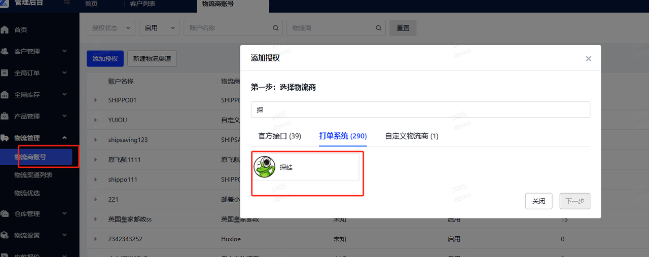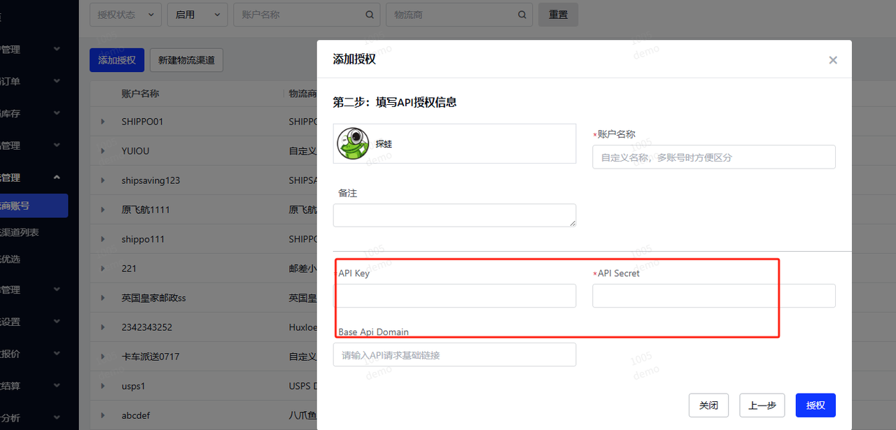 1. 先在探蛙配置好渠道 具体步骤参照==运输渠道/渠道配置== 3. 客户在领星添加授权 - a. 选择物流商--搜索探蛙 - b.在探蛙客户端右上角【个人中心】--接口API--复制apikey和apisecret--填写到领星对应框内  基础API域名,填探蛙客户端网址域名 3.新建物流渠道 物流商账号:选择探蛙(或是您自定义命名的物流商账号) ==API服务代码:是探蛙客户端-系统设置-渠道价格 里面的渠道id==  该操作仅供参考具体操作项请联系领星客服咨询