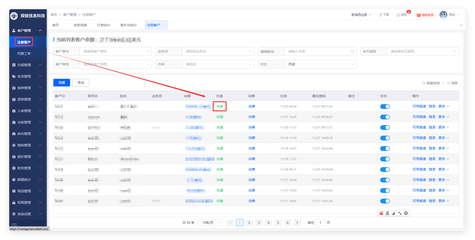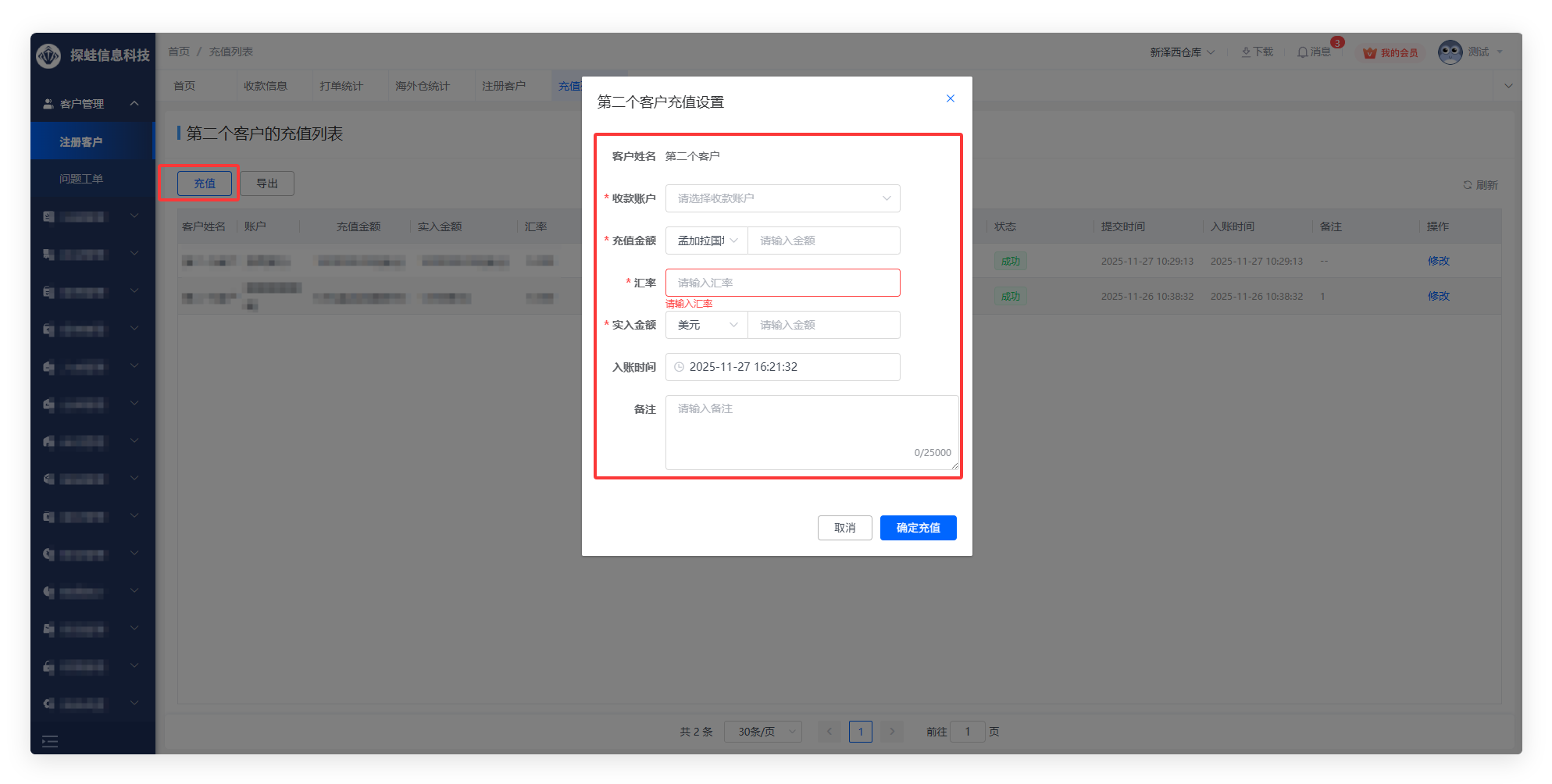 #### 一、给客户充值 **1、增加“收款信息”** - 准备工作:需提前添加收款账户信息(方便后面对账) - 操作路径:系统设置 - 收款信息 - 创建  **2、创建/编辑** * 收款名称:请填写具体的收款方式,如「支付宝」、「XX银行」等。 * 支持币种:支持多种货币收款,请根据您的账户实际情况勾选。 * 收款信息:请准确填写您的收款账户细节(如银行卡号、开户行等)。此信息在您保存后,将对付款方可见  #### 3、给客户充值 操作路径:注册客户 - 选择客户 - 充值  **4、充值填写** * 收款账户:请选择收款账户 * 充值金额:输入本次充值金额 * 汇率:输入相应的币种之间的汇率 * 实际到账金额: 系统将根据输入的汇率自动计算并显示到账金额 * 到账时间:系统默认当前系统时间为成功入账的时间,可手动更改 * 备注:可填写附言、交易ID等额外信息