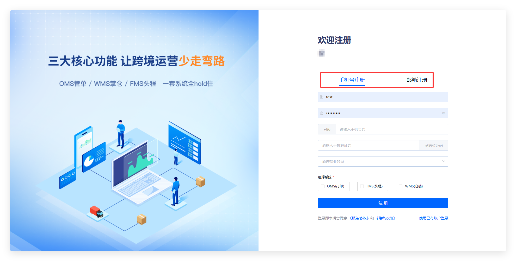 1、按要求填写必填字段:账号、密码、公司名称、手机号、短信、选择需使用的系统。 * 账号:长度必须是 2 至 20 之间。 * 密码:由大小字母、数字、符号组成。长度必须是 8 至 20 之间。 * 公司名称:填写自己公司名称,如是个人可填写工作室名称。 * 手机号:总长度为11位(例如:86 138********)目前我们暂支持中国大陆手机号注册。 * 业务员:选择对应的业务员,如没有可不填写 2、注册提交后,您即可登录系统。  3、选择系统 3.1 OMS (打单) - 订单管理系统: 负责接收来自各个销售渠道(如Amazon、Shopify、eBay等)的客户订单,进行审核、合并、分类。然后生成发货所需的面单,并分配给对应的物流服务商。货代人使用OMS,核心就是高效、准确地“做出”发货面单和“换取”所需的提货凭证。 3.2 FMS (头程) - 头程物流管理系统: 管理货物从中国(起运国)发出,到目的地国海外仓库这一段运输流程。包括海运、空运、铁路等运输方式的订舱、排程、跟踪、成本核算以及处理清关相关事宜。确保大批量货物安全、高效、成本最优地运抵海外仓。 3.3 WMS (海外仓) - 仓库管理系统: 管理入库、上架、库存盘点、拣货、打包、出库等一系列仓内操作。同时还处理本地退换货、贴标、换标等增值服务。提升仓库运作的精确度和效率,实现智能库存管理。