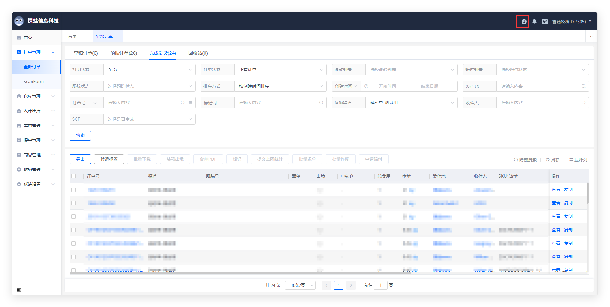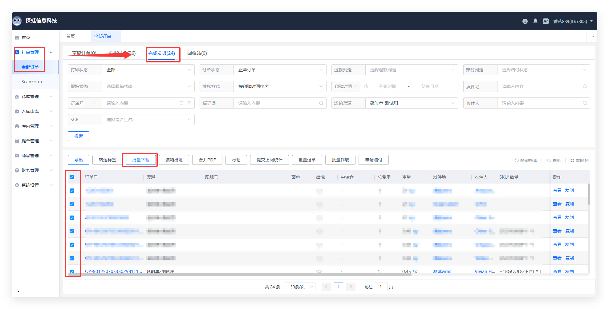 #### 一、操作步骤 * 进入“打单管理-全部订单-批量下载” #### 二、两种方式下载 * 按条件筛选下载 在订单列表中使用搜索条件筛选出目标订单,然后进行批量下载。 * 手动勾选下载 直接勾选需要下载的订单,目前支持5000条批量选择与下载。(通过页码选项)  下载后可去右上角“任务中心”下载